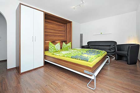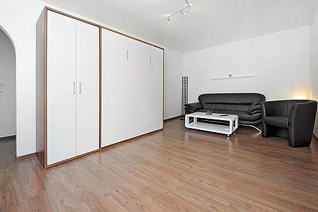 - Betten – besondere Eigenschaften: einige Wohnungen sind im Wohnraum mit einem modernen Schrankbett ausgestattet, welches normale Matratzen hat und tagsüber mit nur einem Handgriff zugeklappt werden kann, so dass man mehr Platz hat.
