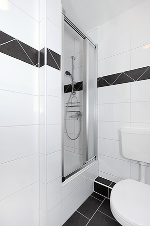 - Badezimmer mit Dusche, Waschtisch und WC