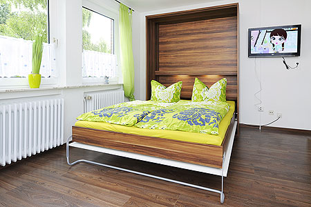 - Betten – besondere Eigenschaften: einige Wohnungen sind im Wohnraum mit einem modernen Schrankbett ausgestattet, welches normale Matratzen hat und tagsüber mit nur einem Handgriff zugeklappt werden kann, so dass man mehr Platz hat.