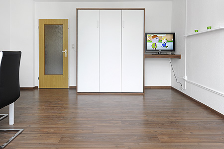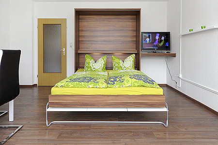 - Betten – besondere Eigenschaften: einige Wohnungen sind im Wohnraum mit einem modernen Schrankbett ausgestattet, welches normale Matratzen hat und tagsüber mit nur einem Handgriff zugeklappt werden kann, so dass man mehr Platz hat.