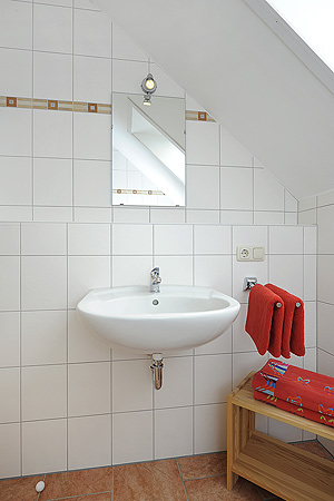 - Badezimmer mit Dusche, Waschtisch und WC